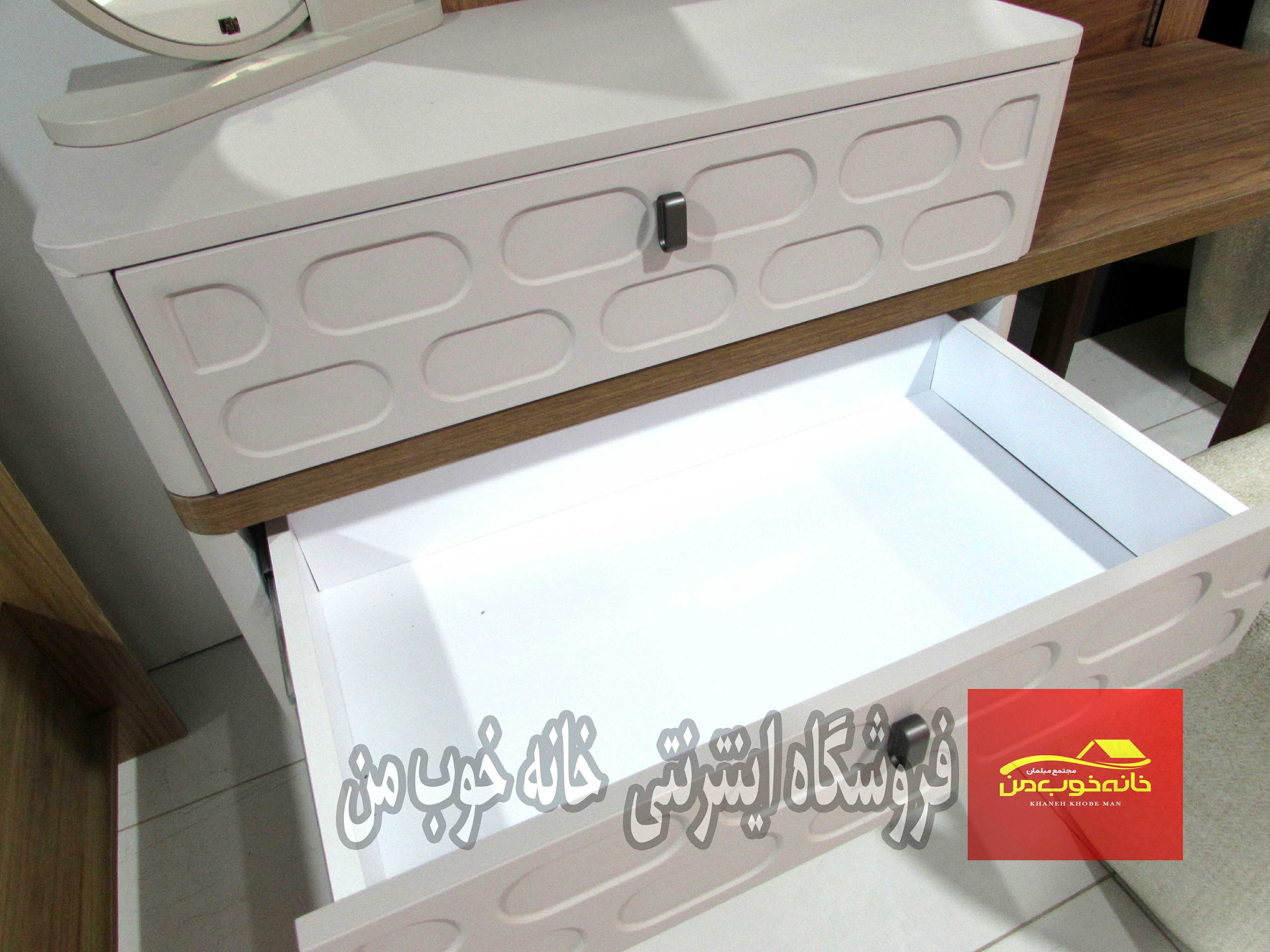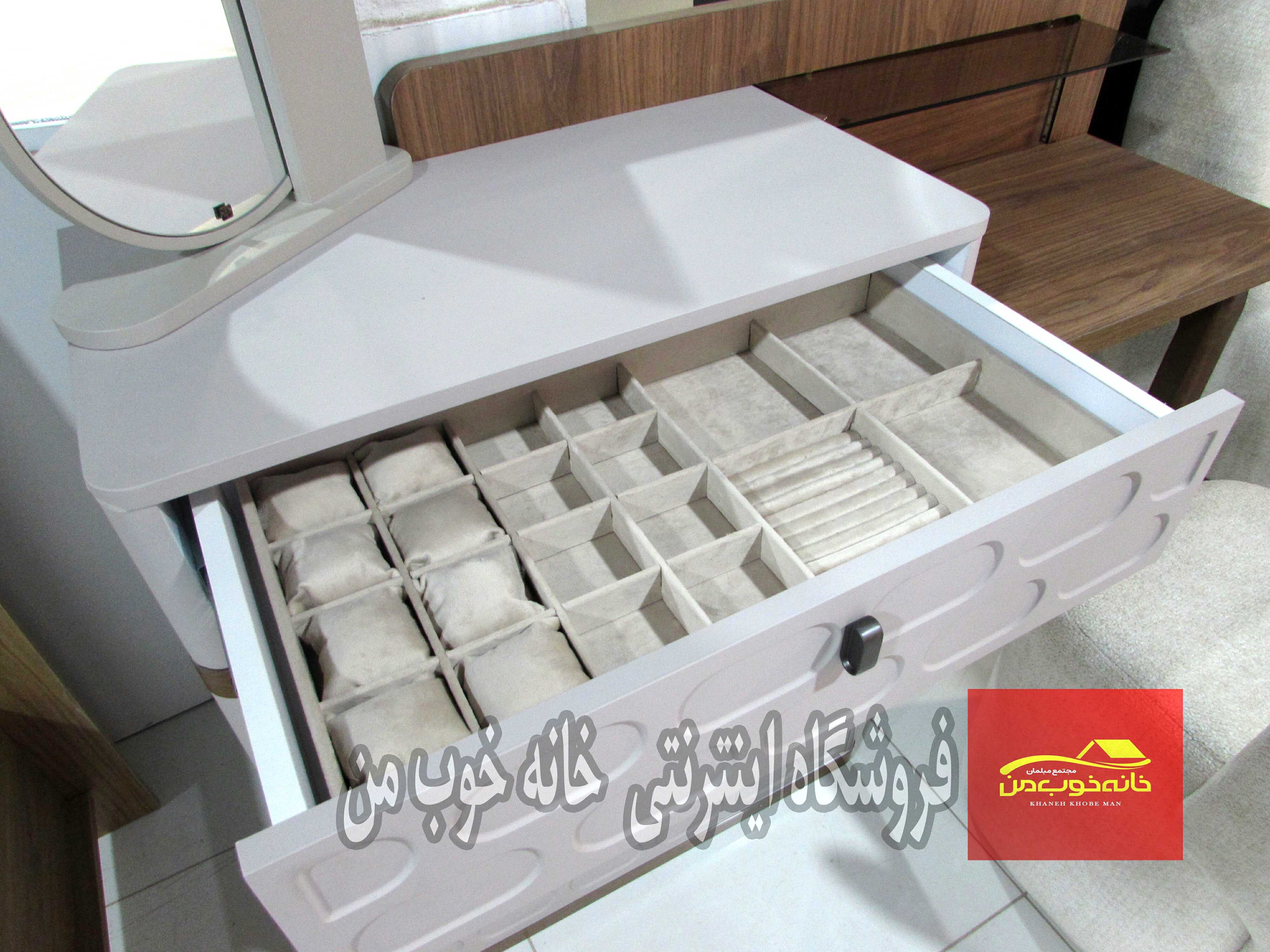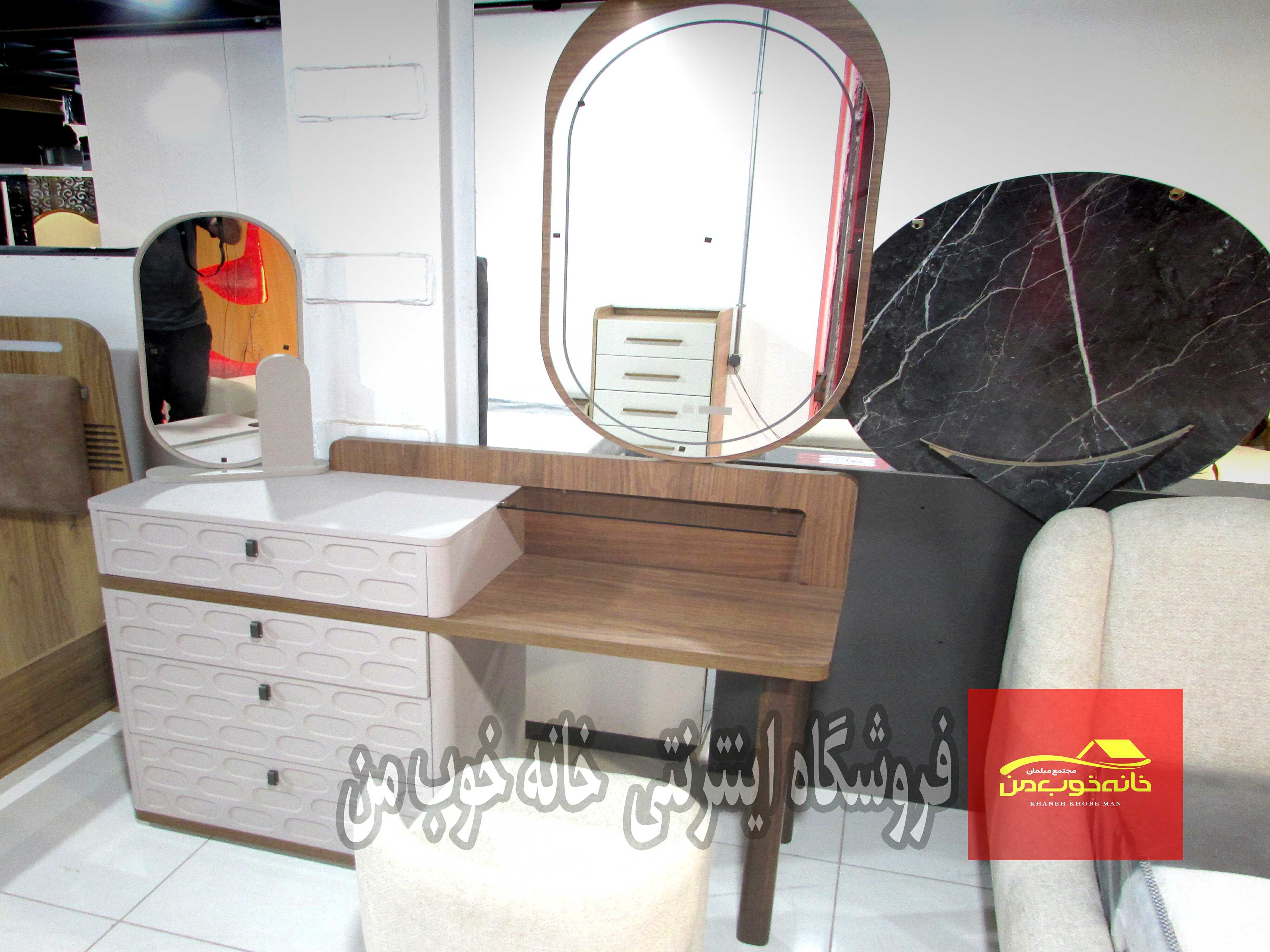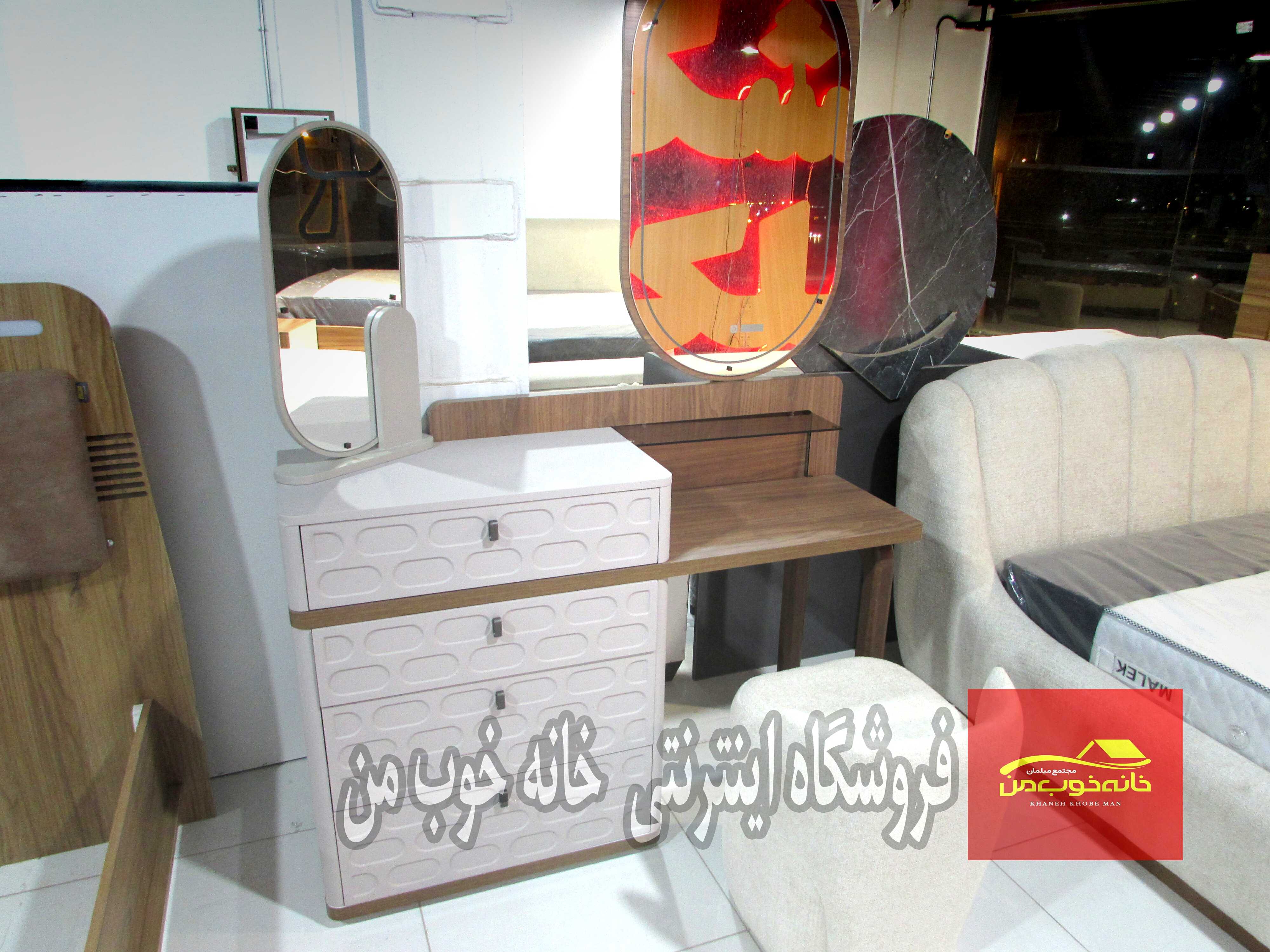 - میز آرایش (دراور) با آینه: با کشوهای جادار و طراحی هماهنگ با تخت. آینه آن میتواند قدی یا رومیزی باشد.