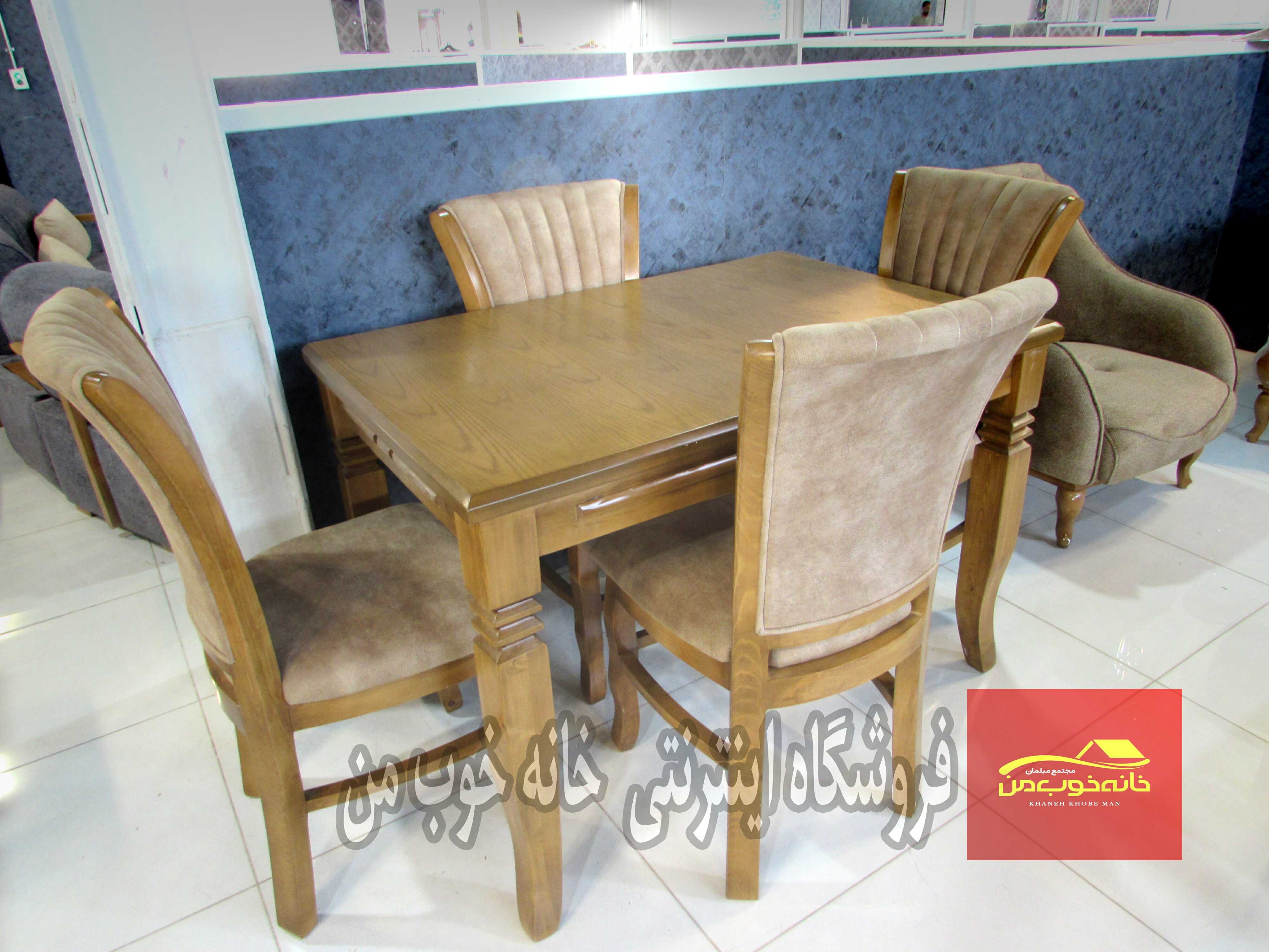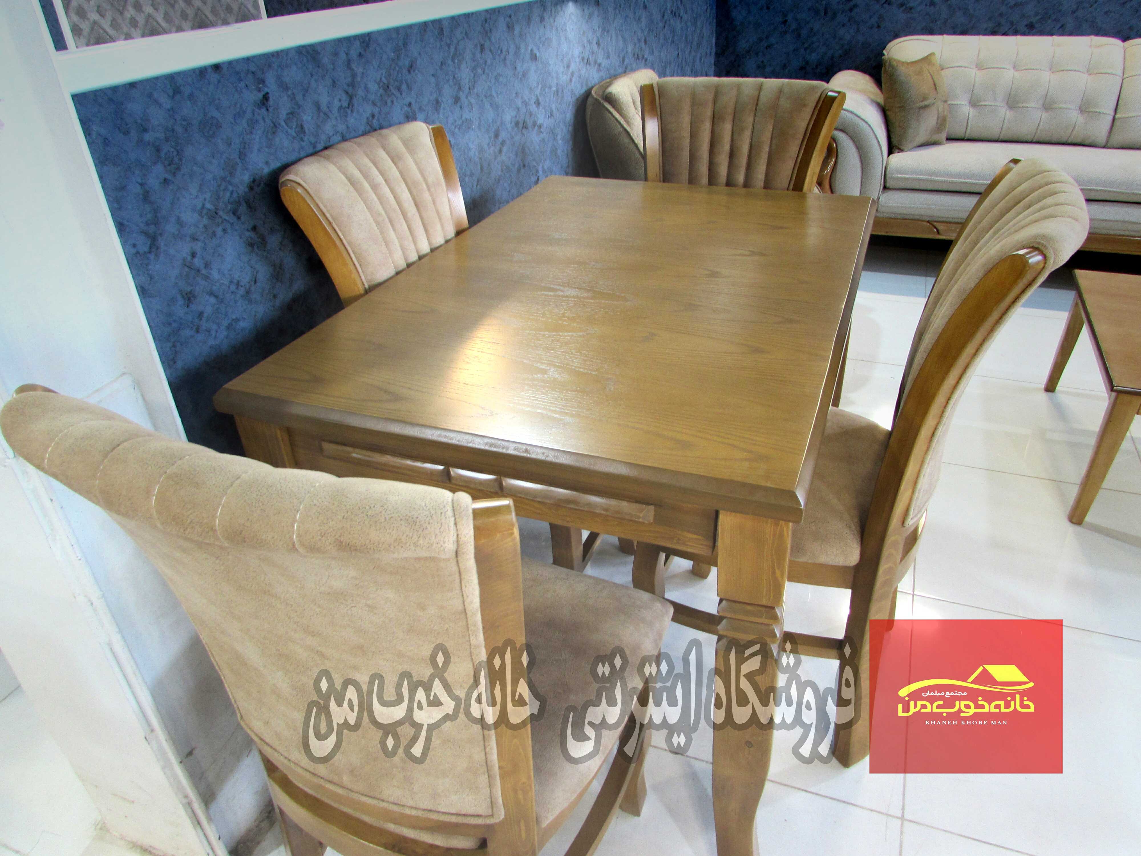 - صندلیها: ۴ عدد صندلی با فریم چوبی محکم، پشتی با طراحی کمی خمیده و پارچه مخمل یا چرم با دوختهای زیبا.