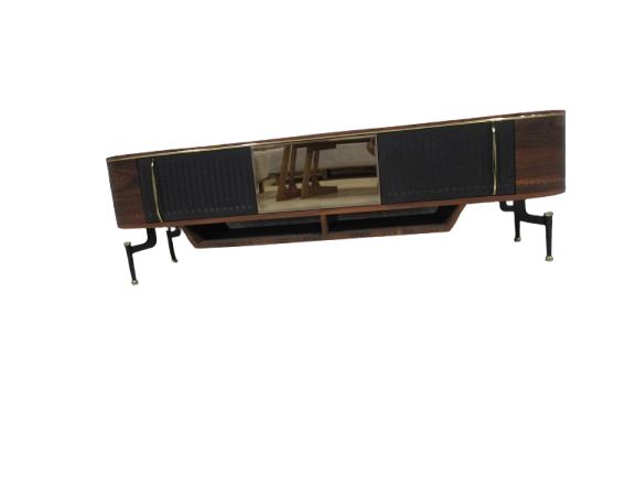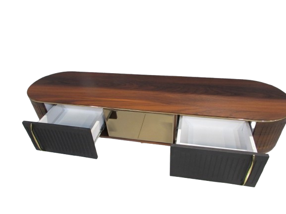 - طراحی میز تلویزیون قهوهای معمولاً مدرن و زیباست. در این تصویر، میز دارای لبههای منحنی و خطوط نرم است که به آن ظاهری شیک و هماهنگ میبخشد.