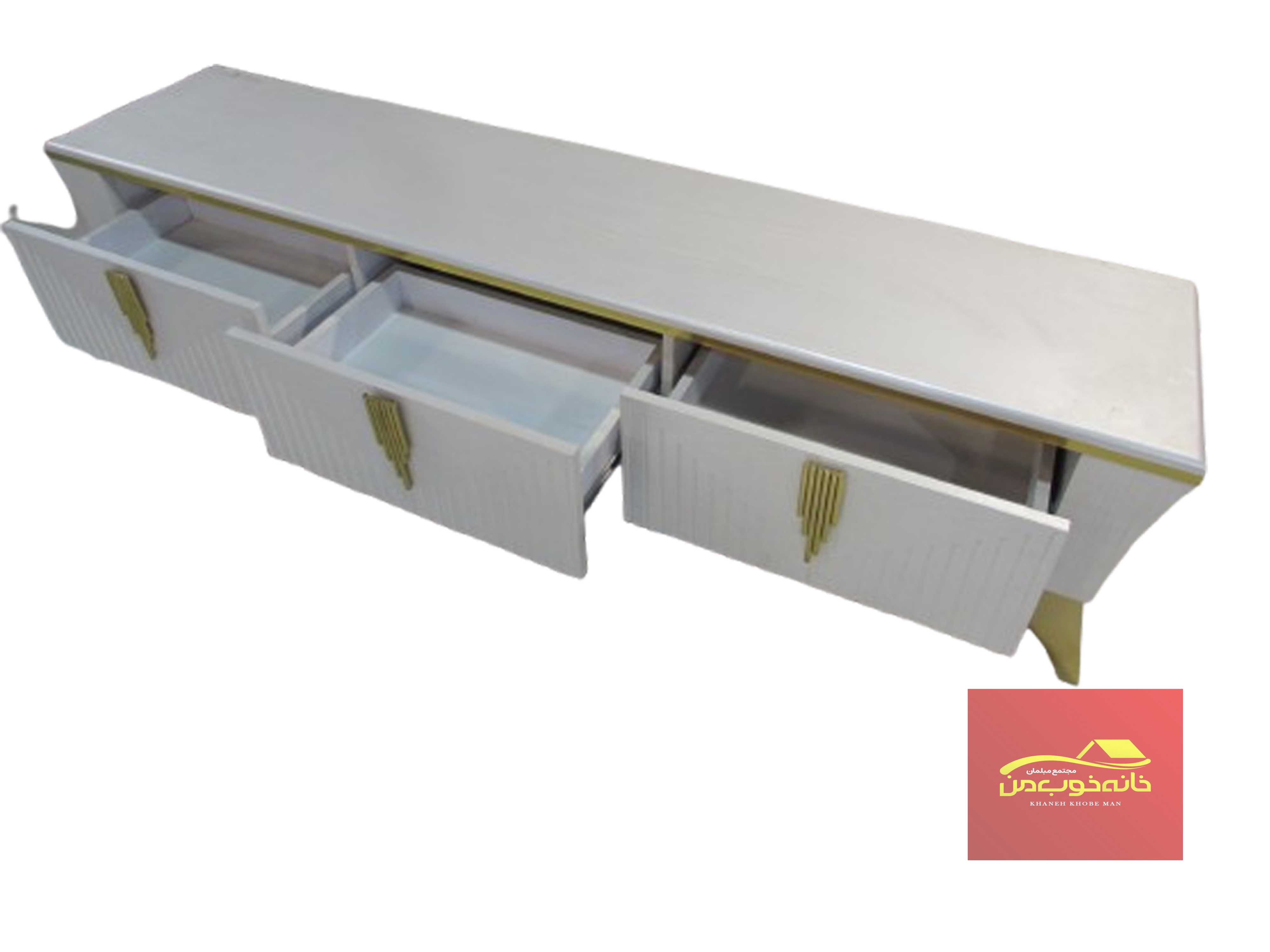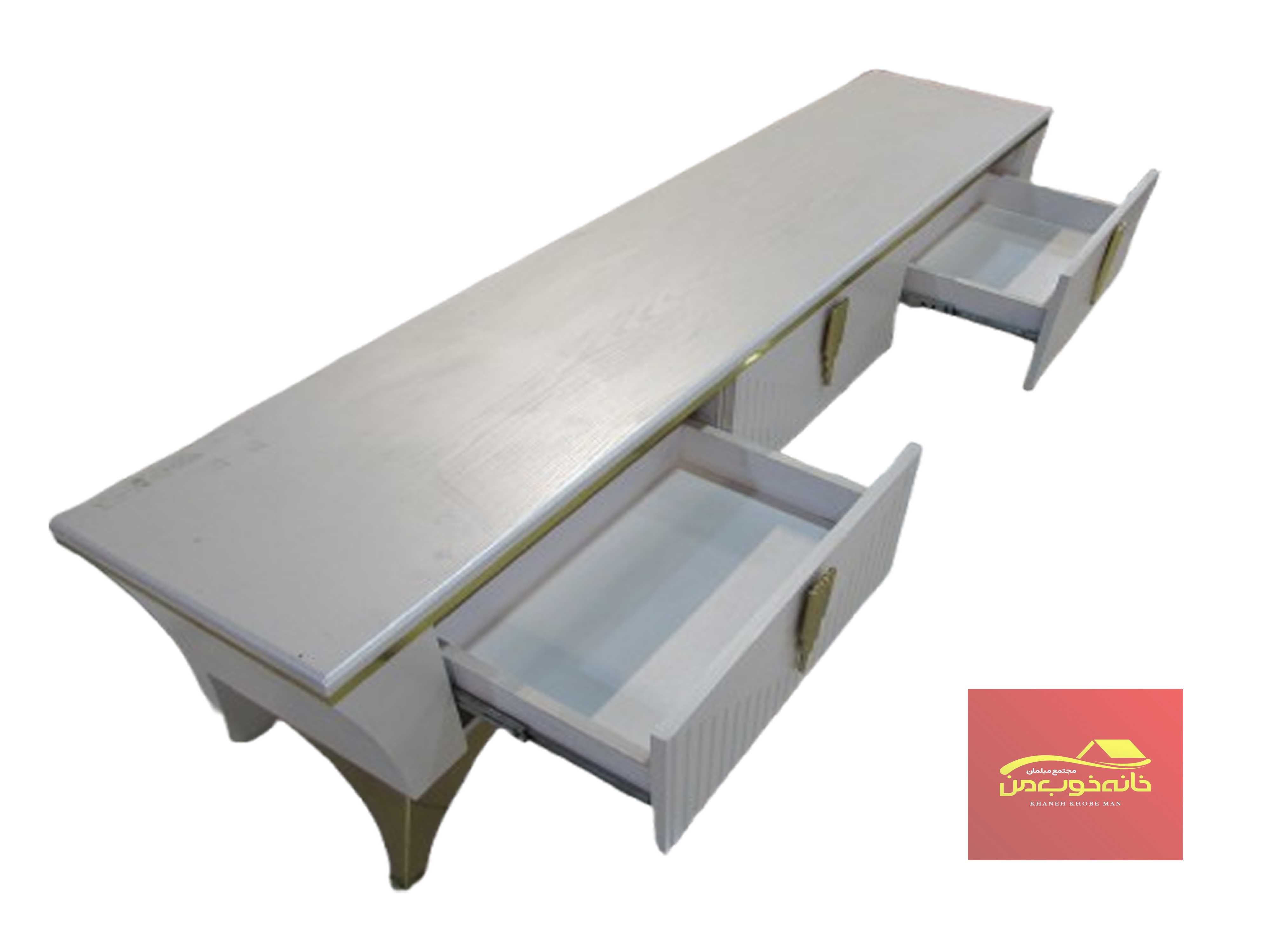 - MDF با روکش ملامینه/هایگلاس/وکیوم: اغلب میزهای تلویزیون سفید از MDF ساخته میشوند که روی آن با روکشهای مختلف پوشانده میشود.