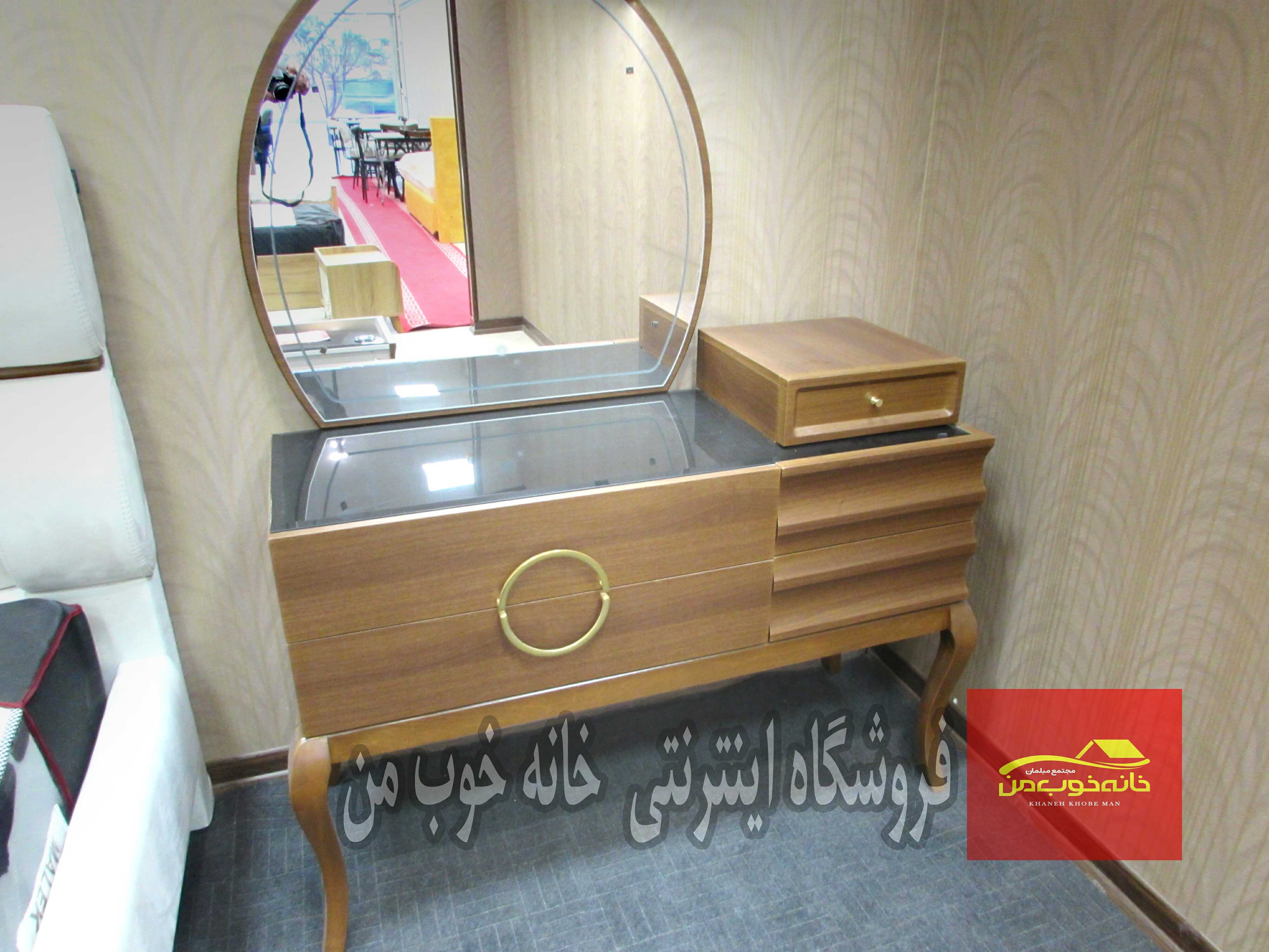 - میز آرایش (کنسول) با آینه گرد و کاربردی: ست زیبای این سرویس با میز آرایشی ظریف و در عین حال جادار کامل میشود. آینه گرد، با فریم چوبی هماهنگ، نوری ملایم و انعکاسی دلنشین ایجاد میکند. کشوهای متعدد این میز، فضای کافی برای نگهداری لوازم آرایش، جواهرات و اکسسوریهای شما را فراهم میآورد و ظاهری منظم و آراسته به اتاق میبخشد. دستگیرههای طلایی و طراحی خاص کشوها، جلوهای از ظرافت و لوکس بودن را به این قطعه اضافه کرده است.